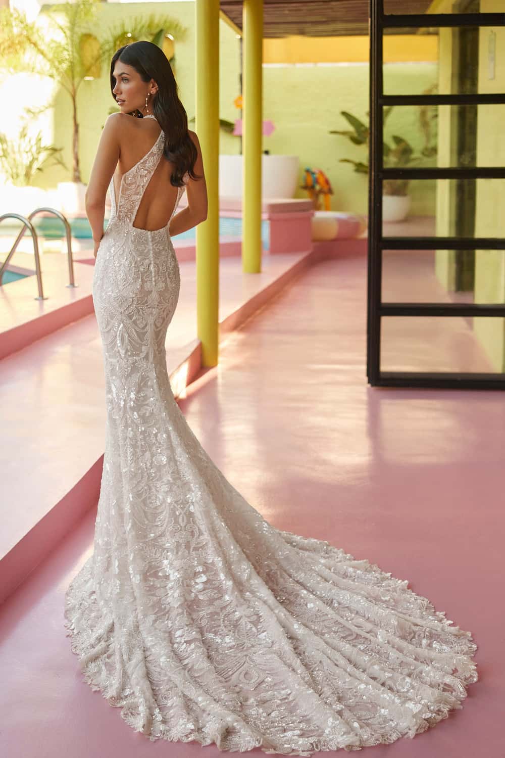 “Jays” è un abito da sposa a sirena interamente in pizzo ricamato, con scollo halter e dettagli preziosi. Un mix perfetto di eleganza moderna e romanticismo firmato Luna Novias by Rosa Clará.