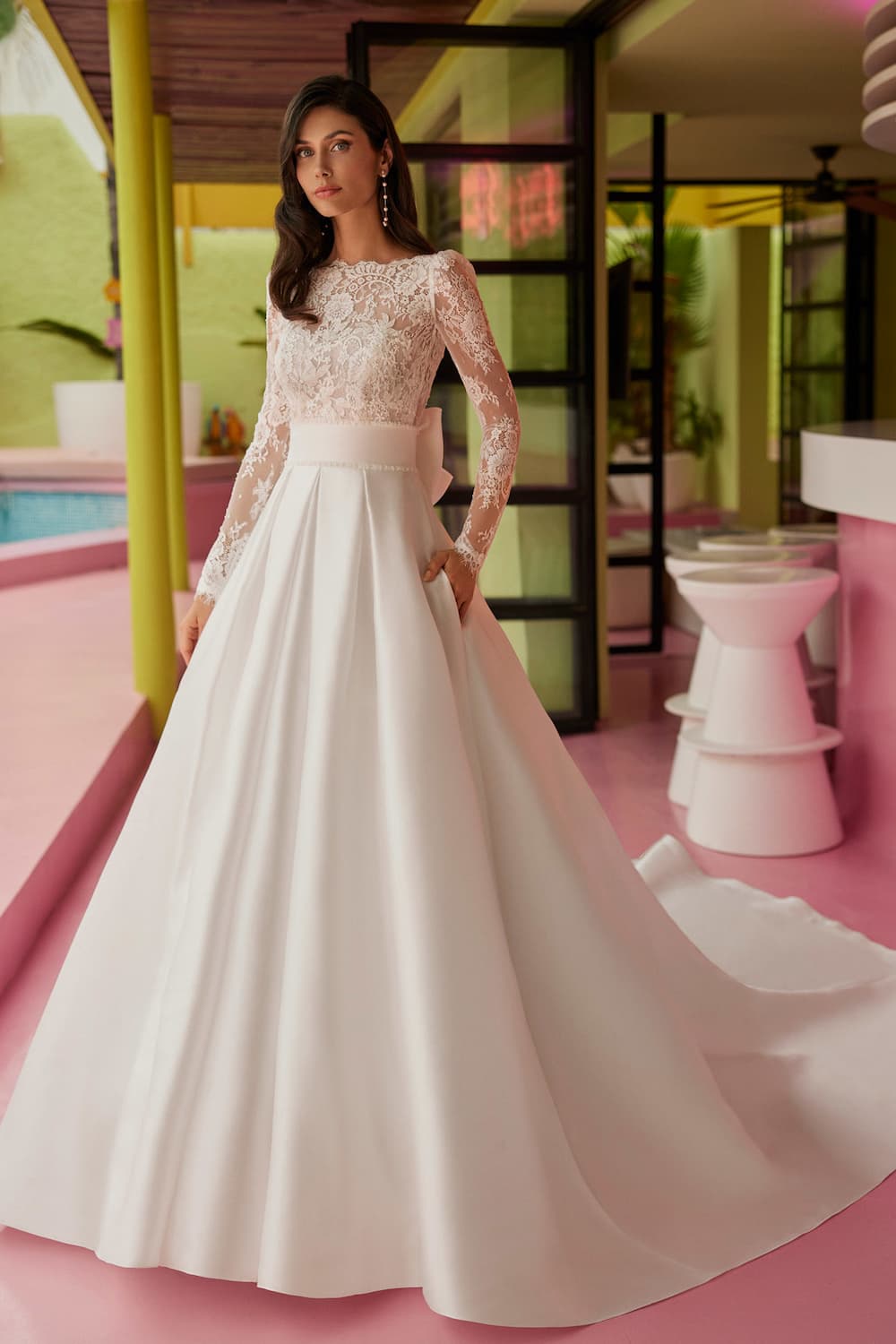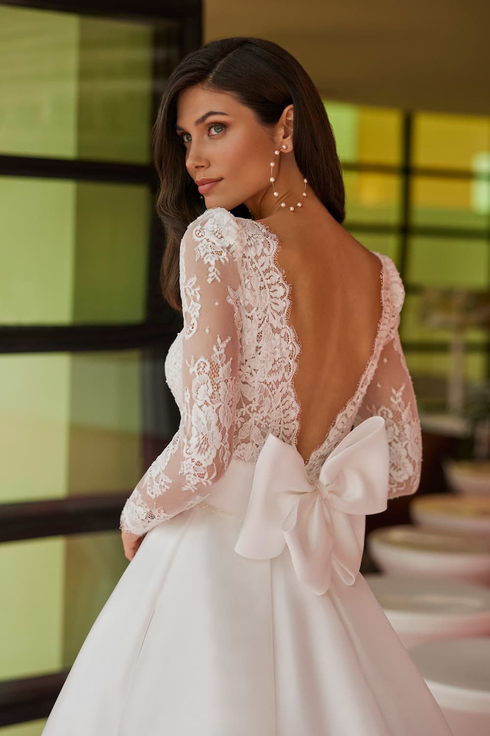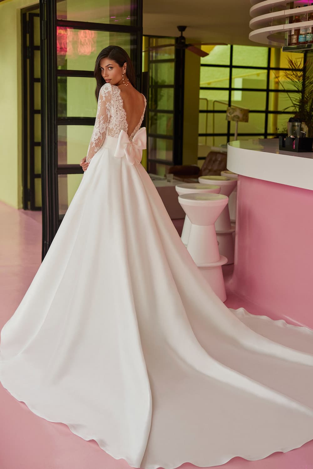 “Jorine” è un abito da sposa principessa in mikado e pizzo chantilly, con maniche lunghe, scollatura off-the-shoulder e un grande fiocco strutturato. Un sogno di eleganza e regalità firmato Luna Novias by Rosa Clará.