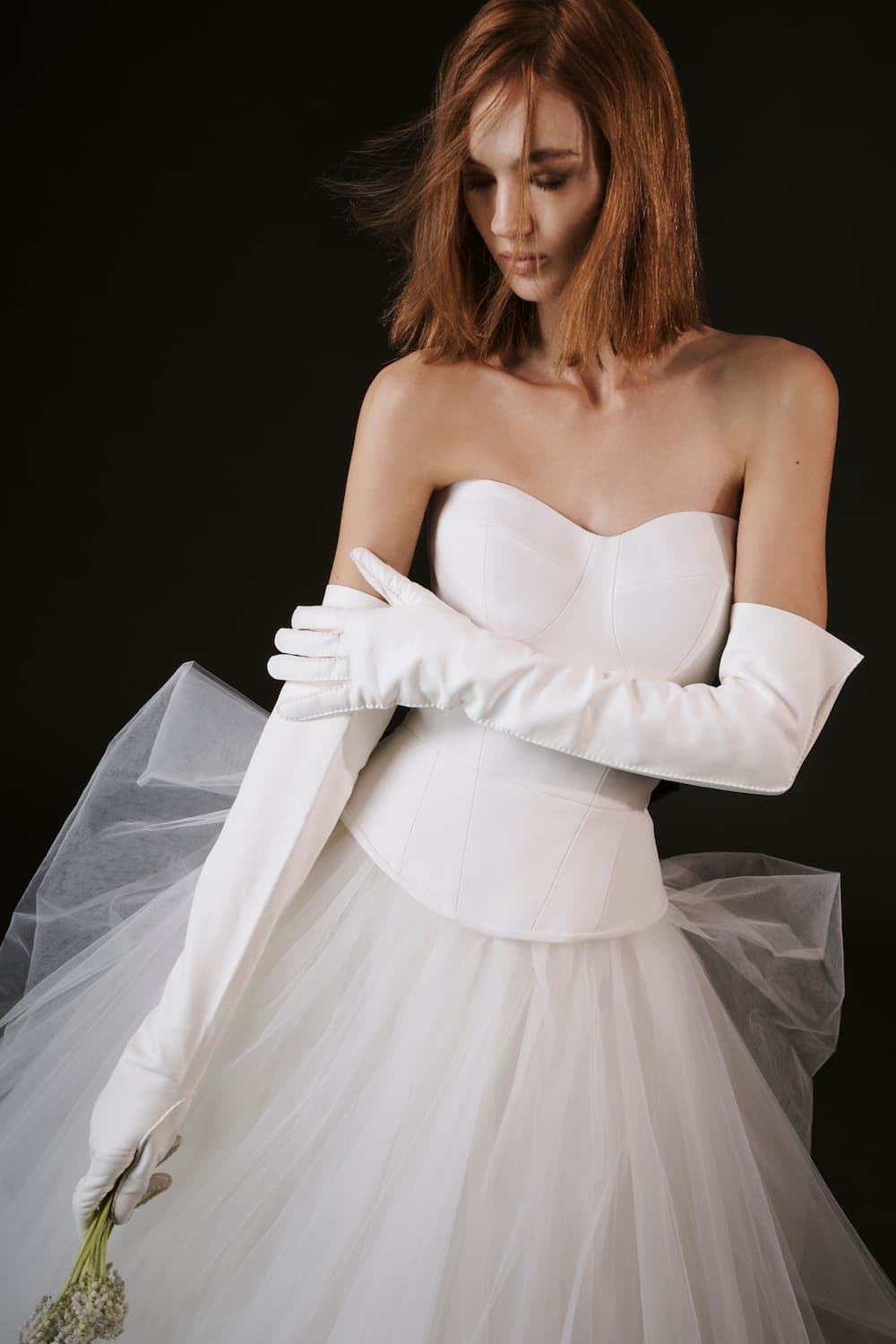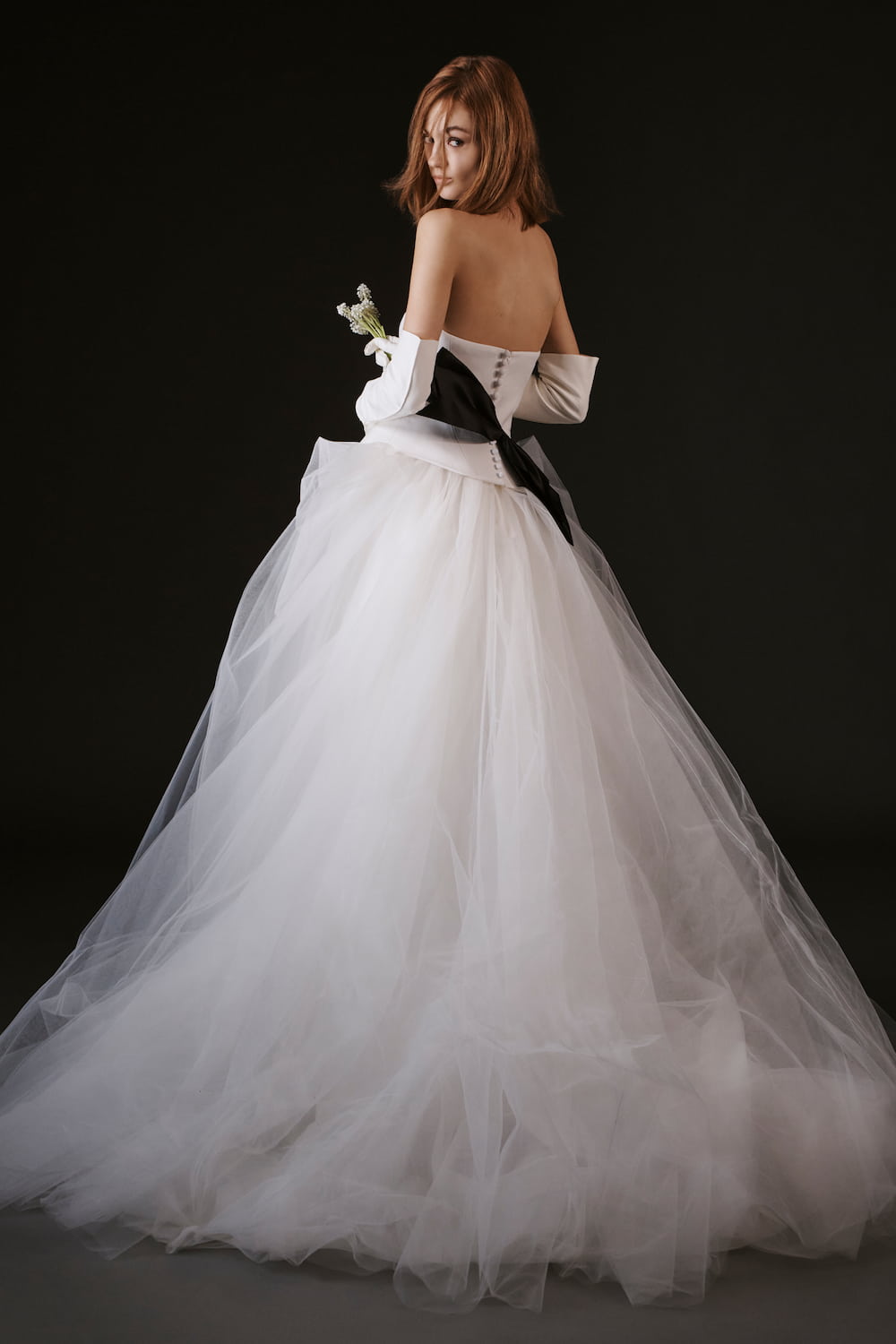 Il bustier steccato con scollo a cuore, raffinato e sensuale, dona struttura al corpetto e crea un delicato effetto lingerie, mentre la chiusura posteriore con bottoncini aggiunge un tocco classico e sofisticato. Ai lati, i drappeggi in tulle leggero donano movimento e armonia all’intero look, creando un effetto dinamico e scenografico.