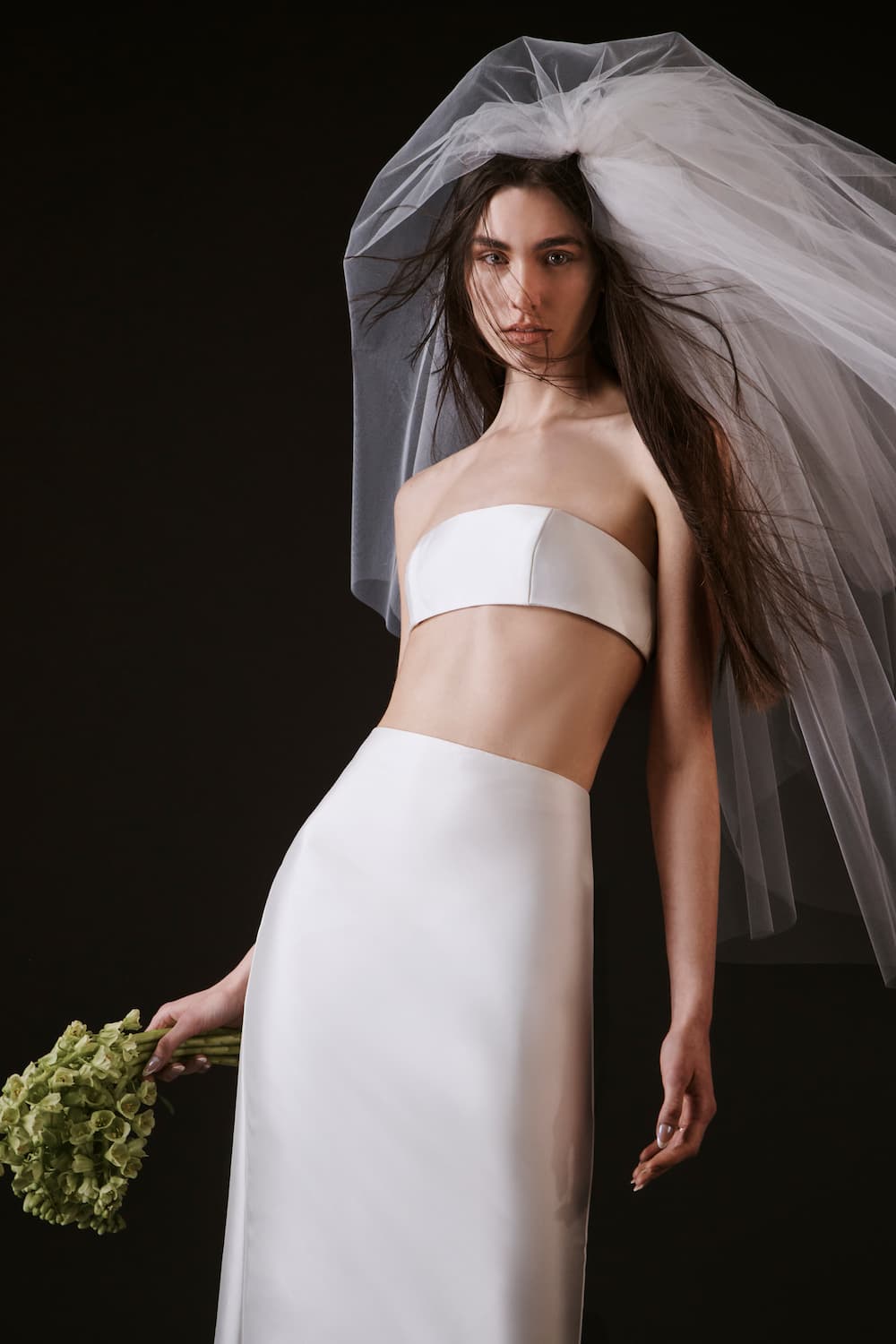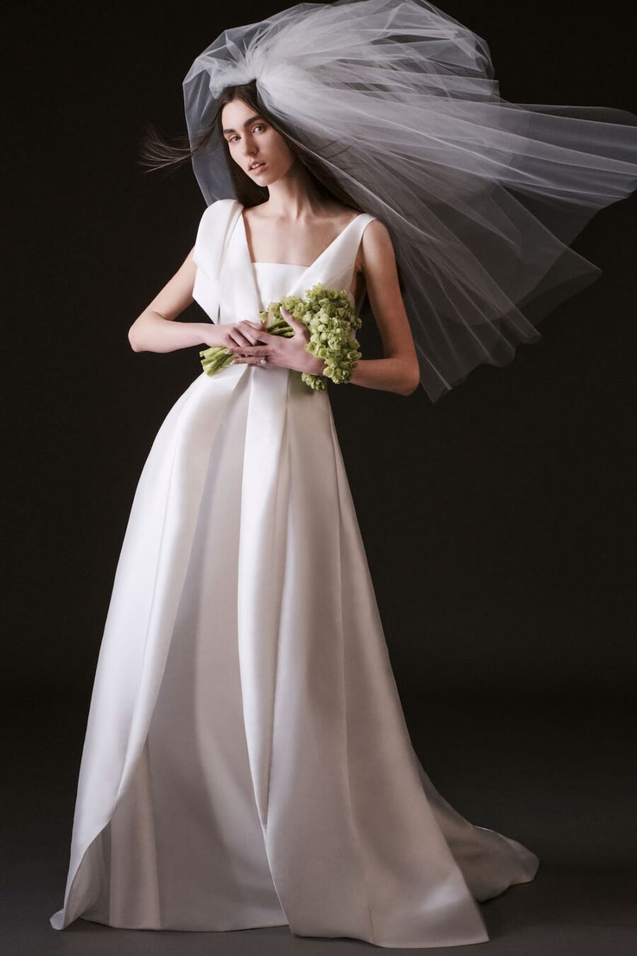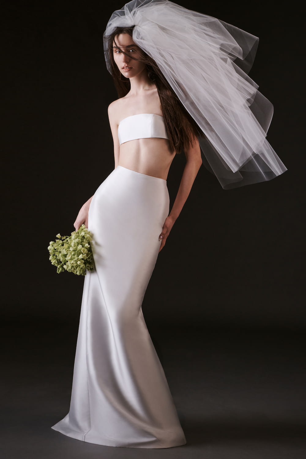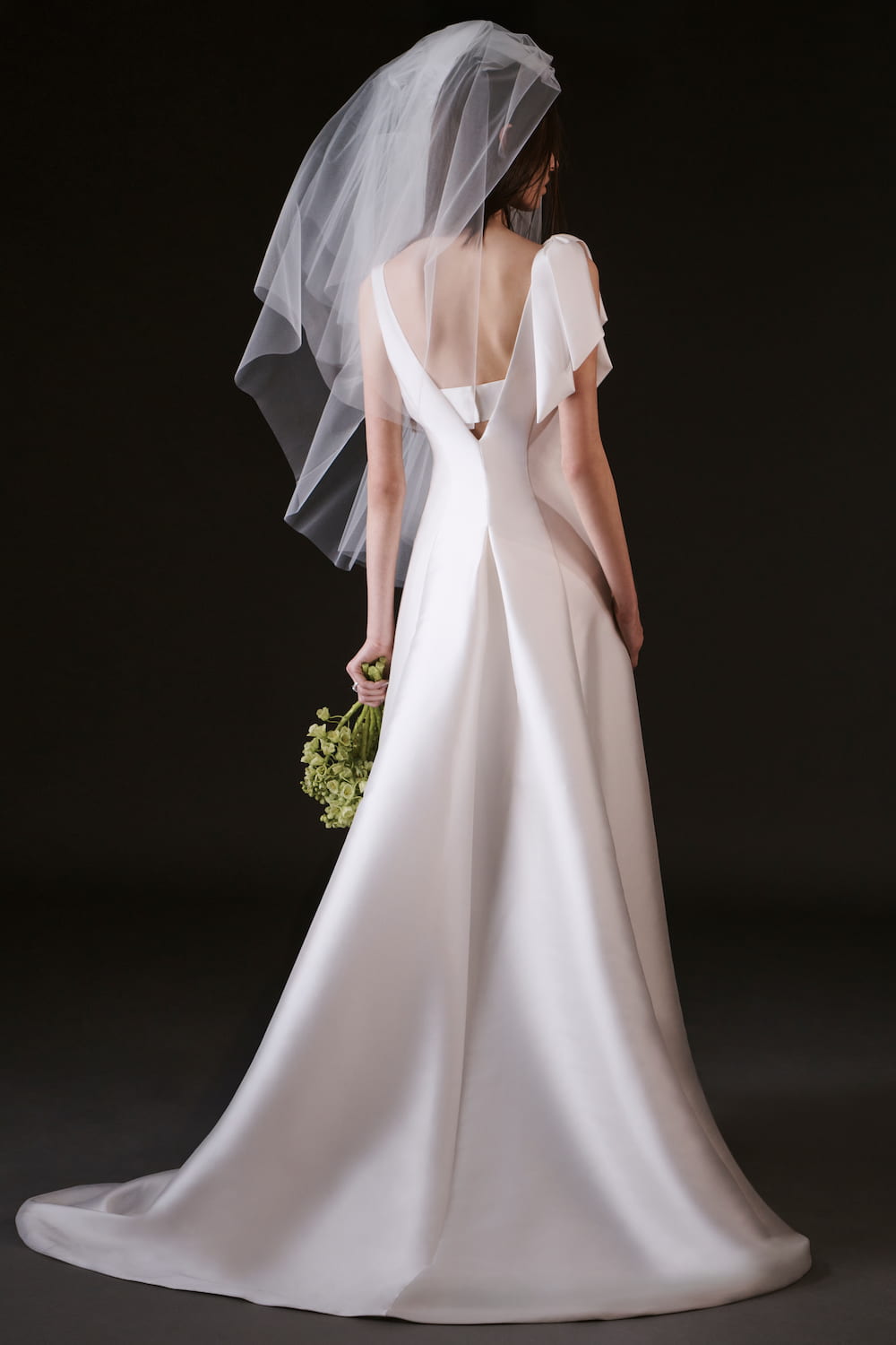 “Ellasandra” è un abito da sposa a tre pezzi in mikado con top a fascia, gonna dritta e soprabito con scollo a V e fiocco sulla spalla. Un capolavoro minimal firmato Vera Wang Bride for Pronovias.