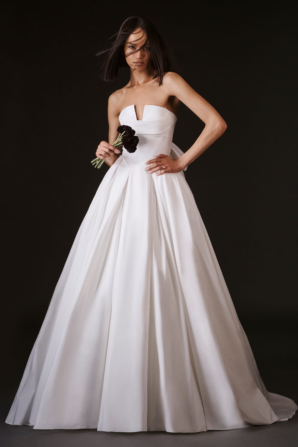 “Kamryn” è un abito da sposa A-line in mikado con scollatura geometrica e maxi fiocco sul retro. Un’eleganza minimal e raffinata firmata Vera Wang Bride for Pronovias.