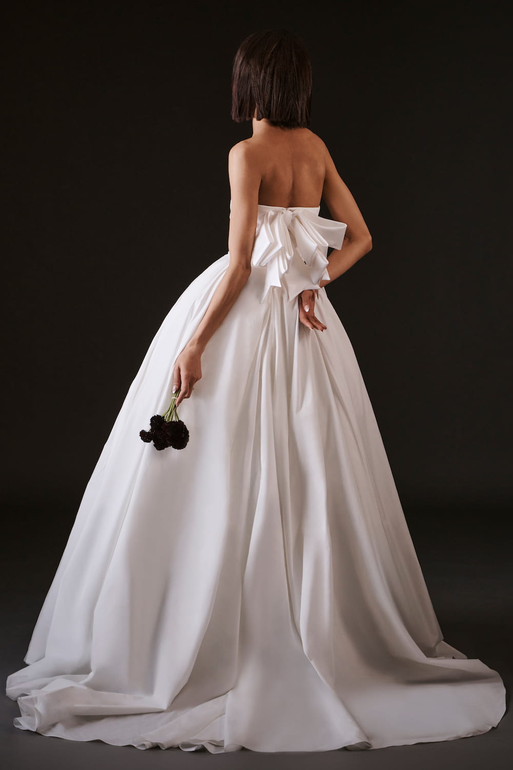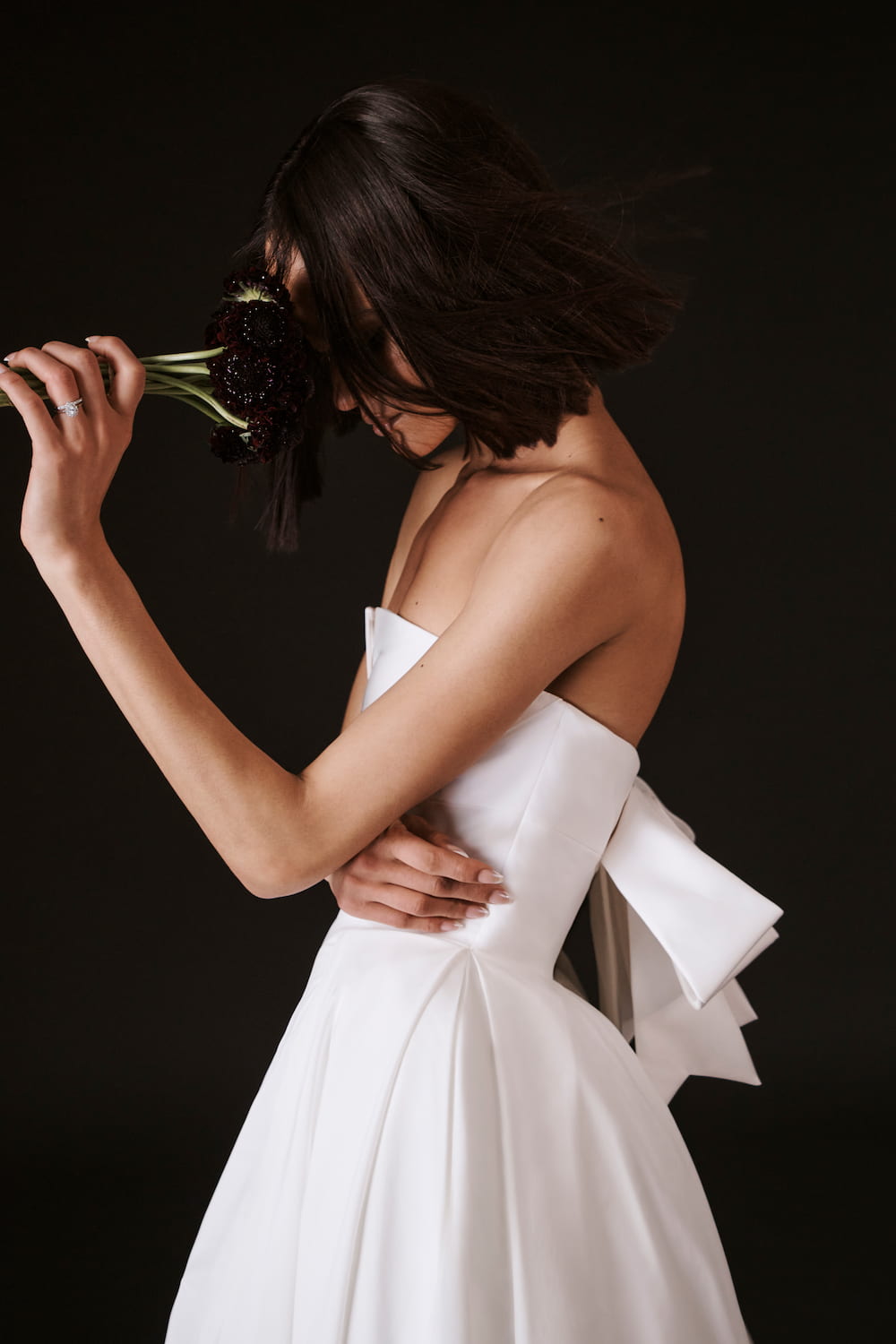 Il dettaglio che cattura l’attenzione è il maxi fiocco tridimensionale in mikado, posizionato al centro del retro: un elemento distintivo e dallo spirito artistico, che aggiunge movimento e un tocco di romanticismo moderno.