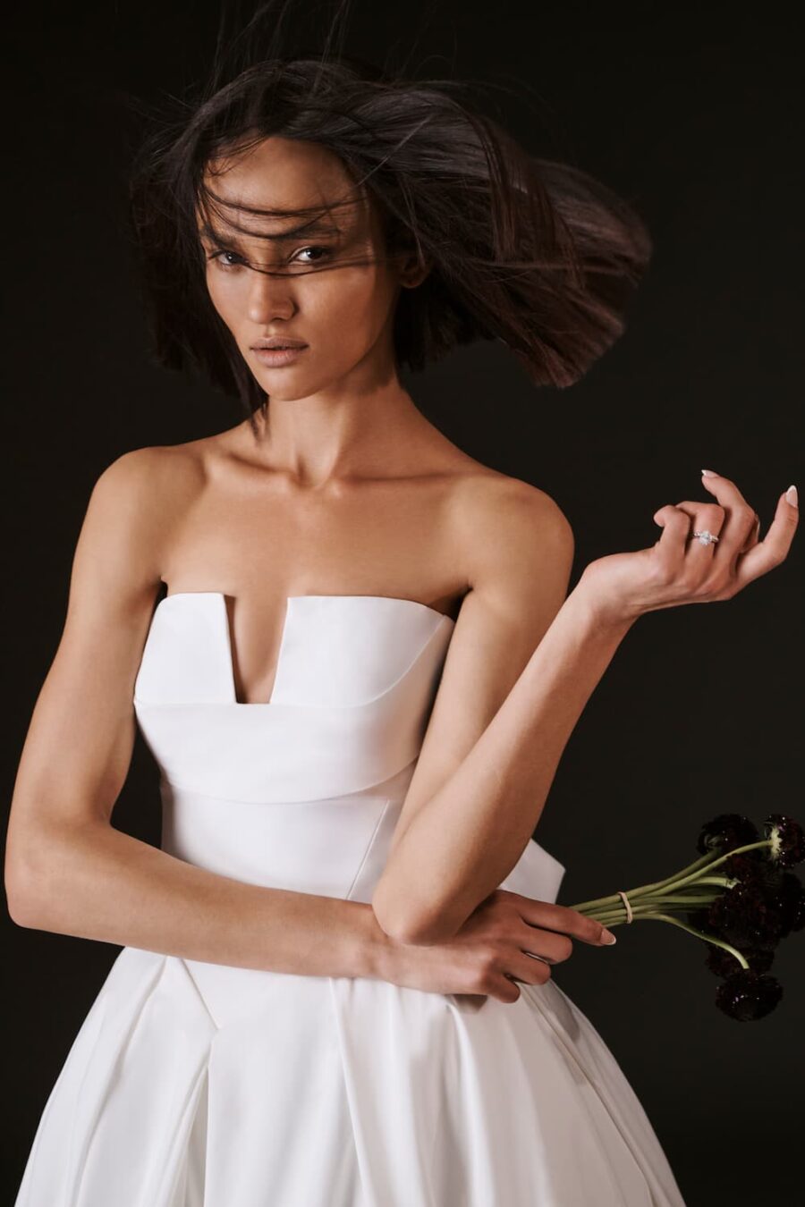 L’abito da sposa “Kamryn” di Vera Wang Bride for Pronovias è una creazione dal fascino moderno e sofisticato, ideale per la sposa che desidera coniugare eleganza, pulizia delle linee e personalità. Realizzato in mikado di altissima qualità, questo modello dalla linea ad A esalta la figura con una struttura impeccabile e un equilibrio perfetto tra minimalismo e impatto scenico.